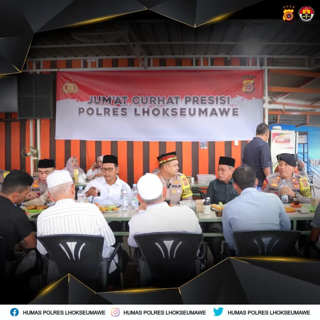 Dalam suasana santai, Kapolres Lhokseumawe menyampaikan bahwa setiap Jumat, Polres Lhokseumawe menggelar program Jum’at curhat pada pagi hari sebagai bentuk kepedulian untuk mendengar dan menerima curhat serta keluh kesah masyarakat.