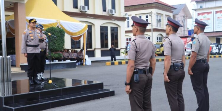 LHOKSEUMAWE – Kapolres Lhokseumawe, AKBP Henki Ismanto, SIK memimpin upacara HUT Satuan Pengamanan (Satpam) ke 42 di lapangan Satya Haprabu, Mapolres Lhokseumawe, Senin (30/1/2023).
