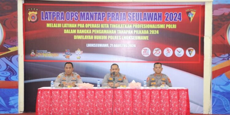 LHOKSEUMAWE – Polres Lhokseumawe menggelar Latihan Pra operasi Mantap Praja Seulawah 2004 dalam rangka meningkatkan profesionalisme Polri dalam pengamanan tahapan Pilkada 2024 yang berlangsung di Gedung Serbaguna Polres Lhokseumawe, rabu (21/8/2024) pagi.