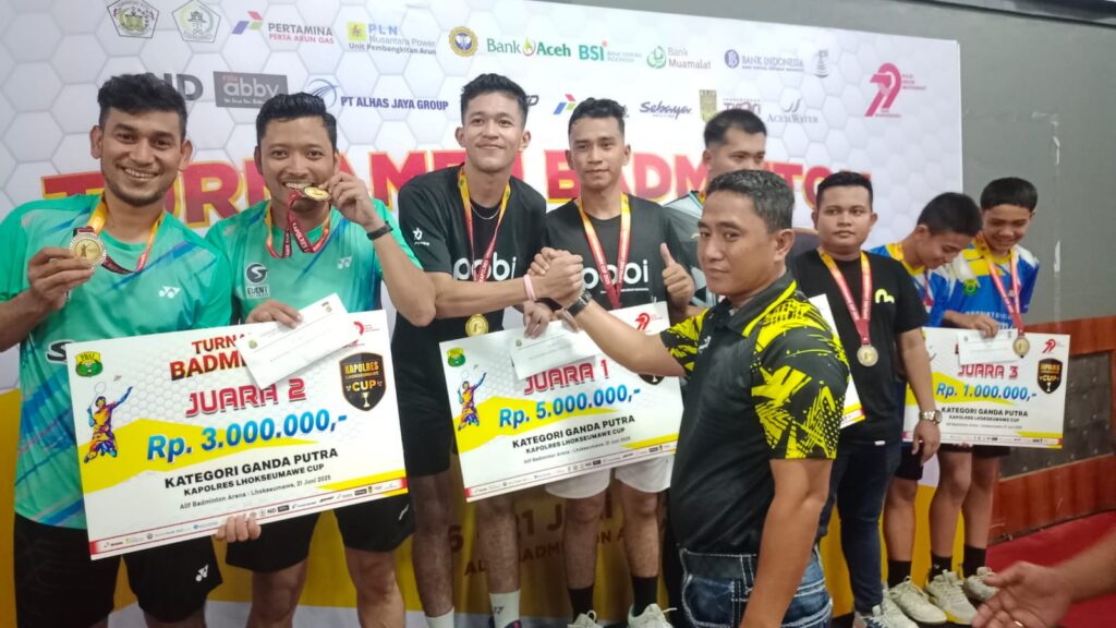 Lhokseumawe – Turnamen Badminton Kapolres Lhokseumawe Cup I resmi ditutup dalam sebuah seremoni yang berlangsung meriah di GOR Alif Badminton, Desa Mon Geudong, Kecamatan Banda Sakti, Kota Lhokseumawe, Sabtu malam (21/6/2025). Kegiatan ini merupakan bagian dari rangkaian peringatan Hari Bhayangkara ke-79 dan memperebutkan total hadiah sebesar Rp35 juta.
