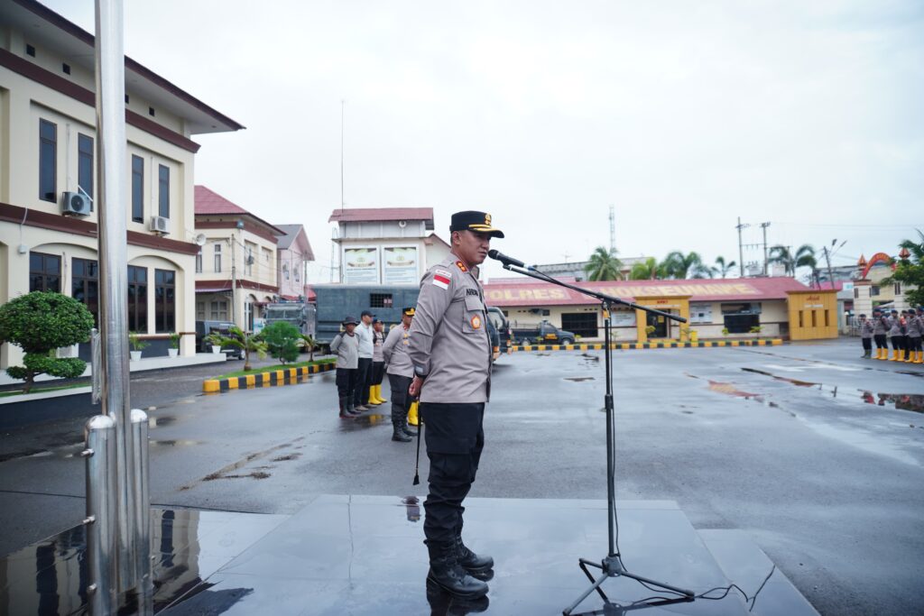 Lhokseumawe — Kapolres Lhokseumawe AKBP Dr. Ahzan, S.H., S.I.K., M.S.M., M.H memimpin apel penyambutan personel perbantuan BKO Brimob 100 personil Brimob dari Polds Kaltim yang akan melaksanakan misi kemanusiaan dalam rangka pemulihan pascabencana banjir di wilayah hukum Polres Lhokseumawe, Minggu (28/12/2025).