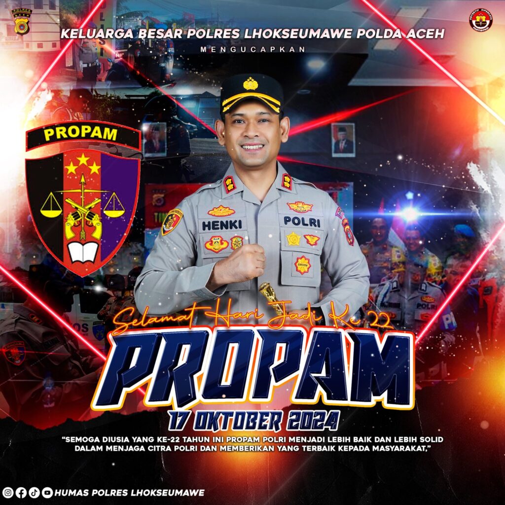 LHOKSEUMAWE – Kapolres Lhokseumawe AKBP Henki Ismanto, S.I.K, melalui Kasi Humas Salman Alfarisi, menyampaikan ucapan selamat memperingati Hari Jadi Propam ke 22 kepada seluruh jajaran Propam Polres Lhokseumawe, kamis (17/10/2024).