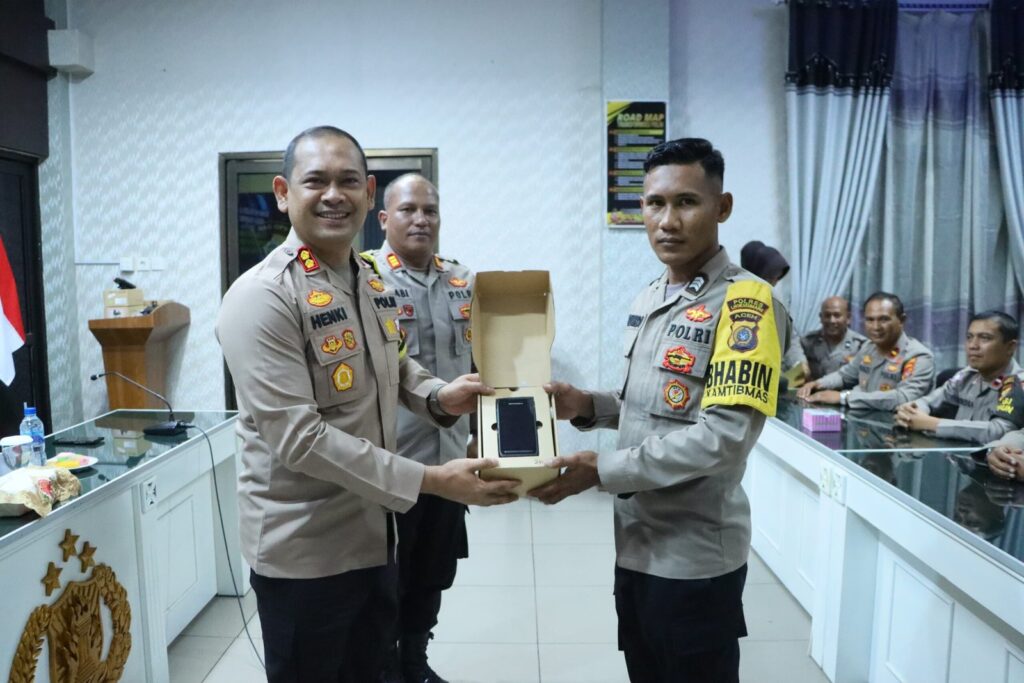 LHOKSEUMAWE – Kapolres Lhokseumawe, AKBP Henki Ismanto, S.I.K., secara simbolis menyerahkan HP Motorola LEX 11 kepada personil Bhabinkamtibmas jajaran Polres Lhokseumawe yang berlangsung di Aula Vicon Polres Lhokseumawe pada Jumat pagi tanggal 03 Mei 2024.