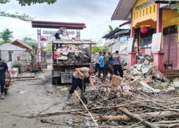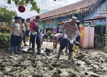 Lhokseumawe — Polres Lhokseumawe bersama personel Batalyon B Pelopor Brimob Polda Aceh melaksanakan kegiatan bakti sosial berupa pembersihan lumpur sisa...