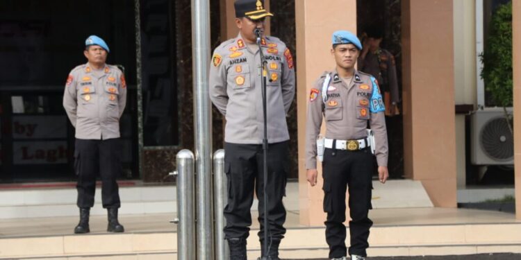 Lhokseumawe – Kapolres Lhokseumawe, AKBP Dr. Ahzan, S.H., S.I.K., M.S.M., M.H., memimpin apel pagi di halaman Mapolres Lhokseumawe, Senin (20/10/2025). Apel diikuti oleh para pejabat utama, perwira, dan seluruh personel Polres Lhokseumawe.