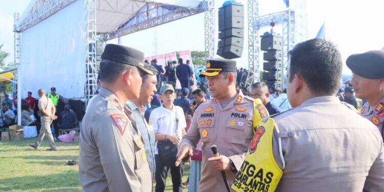 LHOKSEUMAWE – Kapolres Lhokseumawe, AKBP Henki Ismanto turun langsung memantau pengamanan kampanye akbar Partai Nasional Demokrat (Nasdem) di Lapangan bola kaki, Desa Batuphat Barat, Muara Satu, Kota Lhokseumawe, Jumat (2/2/2024) sore.