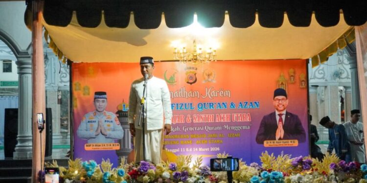 Aceh Utara – Kapolres Lhokseumawe AKBP Dr. Ahzan, S.H., S.I.K., M.S.M., M.H menghadiri sekaligus menutup secara resmi lomba Tahfizul Qur’an dan Azan tingkat pelajar serta santri Kabupaten Aceh Utara yang digelar di Masjid Jami’ Al-Izzah, Krueng Mane, Kabupaten Aceh Utara, Sabtu malam (14/3/2026).