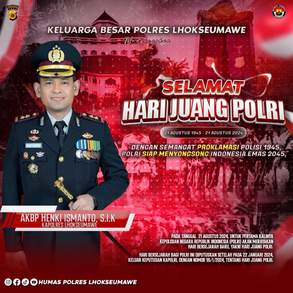 LHOKSEUMAWE – Kapolres Lhokseumawe, AKBP Henki Ismanto, S.I.K, mengucapkan selamat Hari Juang Polri kepada seluruh jajaran kepolisian, khususnya anggota di wilayah hukum Polres Lhokseumawe.