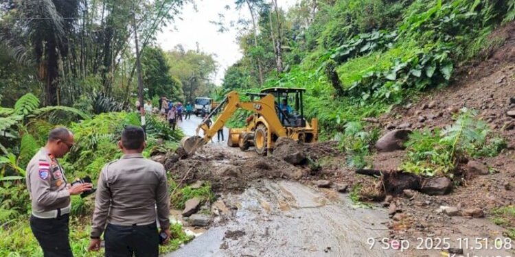 Nagekeo – Kapolres Nagekeo, AKBP Rachmat Muchamad Salihi, S.I.K., M.H., turun ke lokasi bencana tanah longsor di Desa Kelewae, Kecamatan Boawae, Kabupaten Nagekeo, Selasa (9/9/25). Longsor tersebut terjadi pada Senin (8/9/25) dan sempat menutup total badan jalan lintas vital Boawae–Mauponggo.