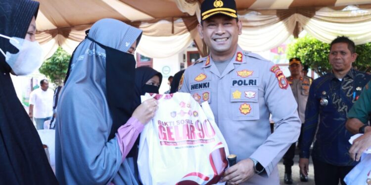 LHOKSEUMAWE – Kapolres Lhokseumawe, AKBP Henki Ismanto memberikan sejumlah paket sembako kepada puluhan santri. kegiatan yang merupakan bagian Bakti sosial (Baksos) Akbari lulusan tahun 1990 tersebut dipusatkan di Mako Polsek Blang Mangat, Polres Lhokseumawe, kamis (26/10/2023).