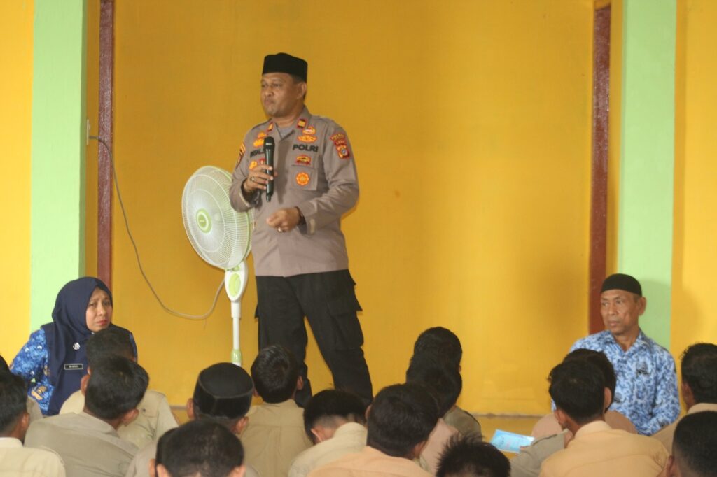 LHOKSEUMAWE – Kapolsek Banda Sakti, Iptu Faisal, SH memberikan sosialisasi dampak negatif kenakalan remaja kepada siswa SMPN 12 Lhokseumawe, Jumat (17/2/2023).