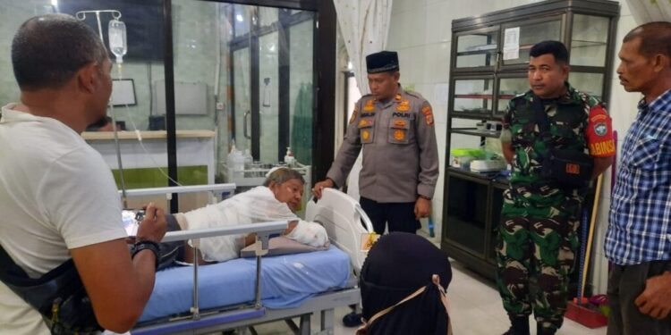 LHOKSEUMAWE – Kapolsek Banda Sakti, Iptu Faisal, SH membesuk korban luka bakar di RS Kasih Ibu Lhokseumawe, Selasa (16/5/20239.