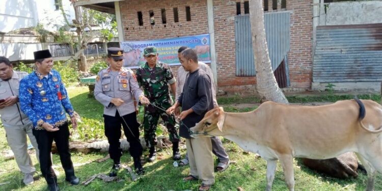 LHOKSEUMAWE – Kapolsek Blang Mangat, Iptu Saprudin bersama unsur Muspika menyerahkan bantuan ketahanan pangan berupa lima ekor sapi di Desa Jambo Mesjid, Kecamatan Blang Mangat, Kota Lhokseumawe, Senin (13/11/2023).