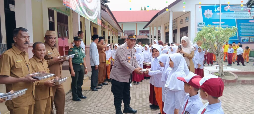 Aceh Utara – Kapolsek Muara Batu AKP Ali Akbar bersama personel Polsek menghadiri launching program Makan Bergizi Gratis (MBG) yang digelar Badan Gizi Nasional (BGN) di Kecamatan Muara Batu, Kabupaten Aceh Utara, Senin (25/8/2025) pagi.