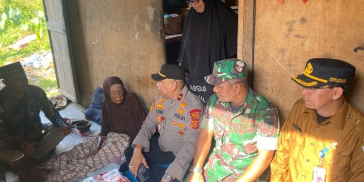 LHOKSEUMAWE – Kapolsek Muara Dua, Ipda Roni, SH bersama anggota TNI Posramil Muara Dua menyerahkan bantuan kepada warga sakit menahun, Senin (8/5/2023).