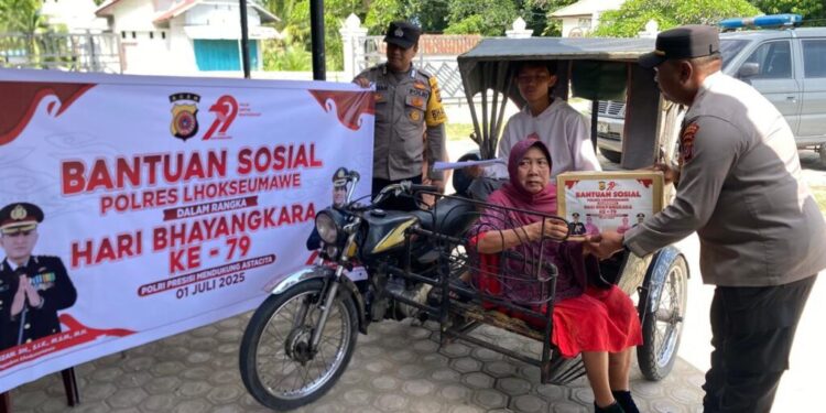 Lhokseumawe – Dalam rangka menyambut Hari Bhayangkara ke-79, Polres Lhokseumawe melalui Polsek Muara Dua menyalurkan bantuan sosial (bansos) kepada masyarakat kurang mampu di wilayah hukumnya. Penyerahan bantuan ini dilaksanakan pada Kamis (19/6/2025) sekitar pukul 08.00 WIB di Desa Meunasah Mesjid, Kecamatan Muara Dua, Kota Lhokseumawe.