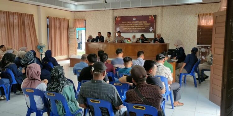 LHOKSEUMAWE – Kapolsek Muara Satu, Iptu Syadli bersama unsur muspika menghadiri pembukaan rapat pleno rekapitulasi hasil penghitungan suara Pemilu di kantor camat Muara Satu, Kota Lhokseumawe, Minggu (18/2/2024).