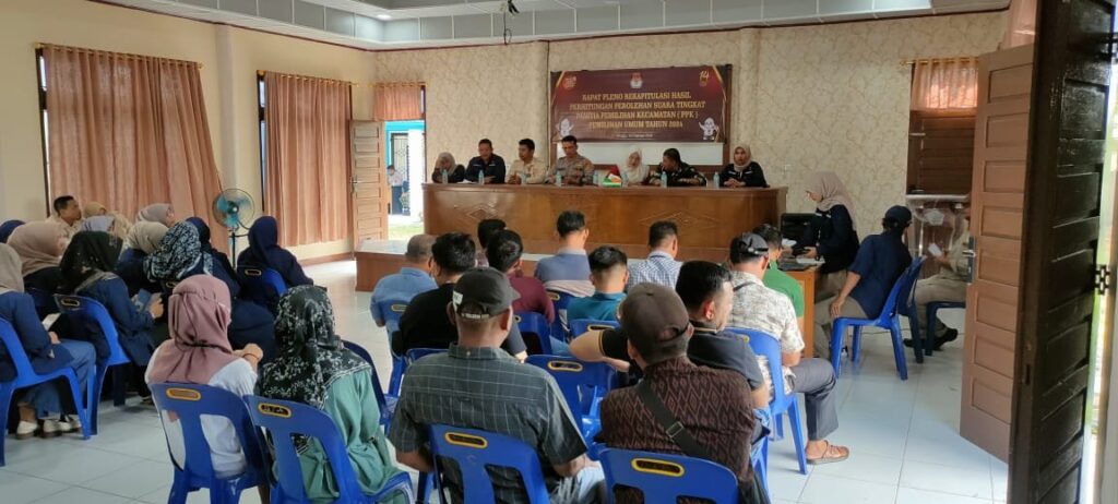 LHOKSEUMAWE – Kapolsek Muara Satu, Iptu Syadli bersama unsur muspika menghadiri pembukaan rapat pleno rekapitulasi hasil penghitungan suara Pemilu di kantor camat Muara Satu, Kota Lhokseumawe, Minggu (18/2/2024).