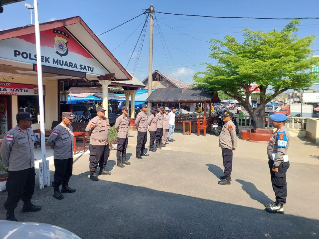 Lhokseumawe – Kapolsek Muara Satu Iptu Abdul Karim memimpin apel pagi personel Polsek Muara Satu di halaman Mapolsek Muara Satu Polres Lhokseumawe, Kamis (23/4/2026) pagi.