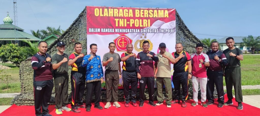 LHOKSEUMAWE – Kapolsek Simpang Keuramat, Iptu Gunawan Adi menghadiri olahraga bersama TNI – Polri di Mako Batalyon Kaveleri 11/MSC, Selasa (2/5/2023).