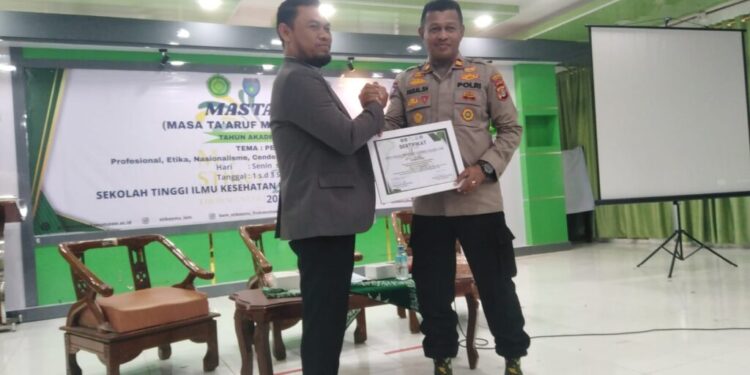 Lhokseumawe – Kasat Binmas Polres Lhokseumawe IPTU Faisal, SH menyampaikan materi penegakan hukum kepada mahasiswa baru Sekolah Tinggi Ilmu Kesehatan (STIKes) Muhammadiyah Lhokseumawe yang berlangsung di Aula Kiai Ahmad Dahlan STIKes Muhammadiyah Kota Lhokseumae, Selasa (2/9/2025) pagi.