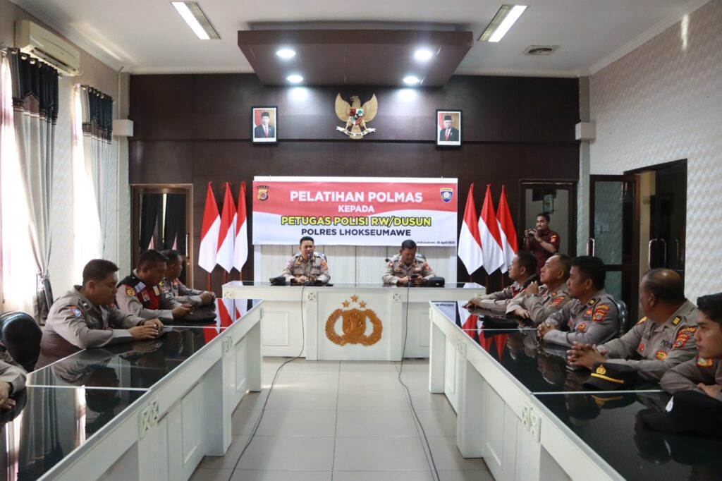 LHOKSEUMAWE – Kasat Binmas Polres Lhokseumawe, AKP Arifin Ahmad, S.Sos memberi pelatihan Polmas kepada Polisi Dusun atau RW, kegiatan ini berlangsung di ruang Vicon Mapolres Lhokseumawe, Kamis (4/5/2023).