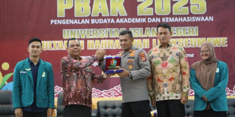 Lhokseumawe – Dalam rangka kegiatan Pengenalan Budaya Akademik dan Kemahasiswaan (PBAK) Tahun 2025, Kasat Binmas Polres Lhokseumawe, IPTU Faisal, S.H., hadir sebagai pemateri di Universitas Islam Negeri (UIN) Sultanah Nahrasyiah Lhokseumawe, Kamis (28/8/2025).