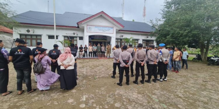 LHOKSEUMAWE – Ipda Yudira Kasubsektor Nisam Antara, Ipda Yudira Nugraha memimpin apel gabungan pengamanan Tempat Pemungutan Suara (TPS) Pemilu 2024 di halaman kantor camat Nisam Antara, Polres Lhokseumawe, Senin (12/2/2024).