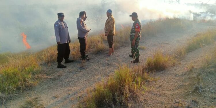 LHOKSEUMAWE – Personel Polsek Muara Satu mengamankan TKP kebakaran lahan di Dusun III Ulee Buket, Desa Blang Panyang, Kecamatan Muara Satu, Kota Lhokseumawe, Jumat (7/7/2023).