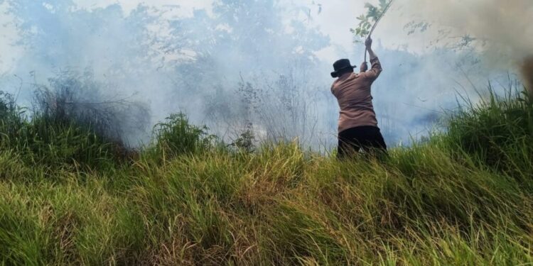 Kebakaran Lahan di Blang Panyang, Personel Polsek Muara Satu Bantu Padamkan Api
