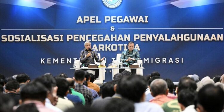 Jakarta – Kementerian Transmigrasi bersama dengan (BNN) Badan Narkotika Nasional, menggelar Sosialisasi Pencegahan Penyalahgunaan Narkotika di Gedung Makarti Muktitama, Jumat (25/7/25). Sosialisasi dirangkaian dengan tes narkotika yang dilakukan oleh seluruh jajaran pegawai, termasuk Menteri Transmigrasi, M. Iftitah Sulaiman Suryanagara.