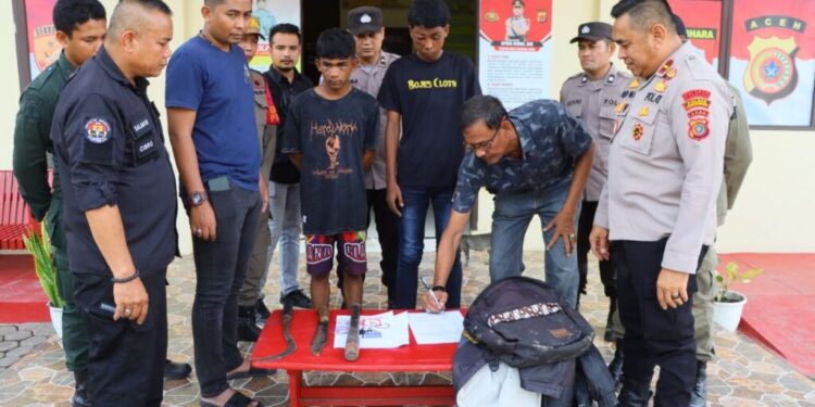 Kepada awak media, minggu (21/4/2024), Kapolres Lhokseumawe AKBP Henki Ismanto, S.I.K melalui Kapolsek Muara dua IPDA Roni mengatakan, mereka diamankan oleh warga setempat setelah diketahui membawa berbagai barang bukti, termasuk senjata tajam seperti celurit dan parang, serta sebuah stik baseball. Selain itu, sebuah sepeda motor juga turut diamankan.