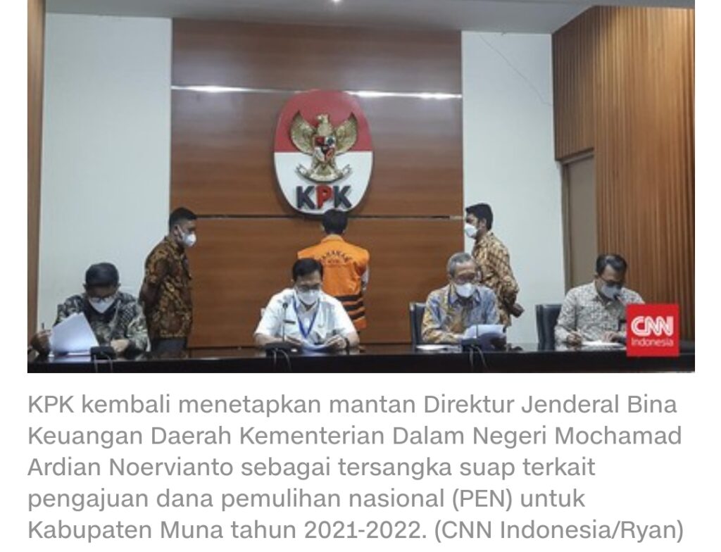 Jakarta — Komisi Pemberantasan Korupsi (KPK) kembali menetapkan mantan Direktur Jenderal Bina Keuangan Daerah Kementerian Dalam Negeri Mochamad Ardian Noervianto sebagai tersangka suap terkait pengajuan dana pemulihan nasional (PEN) untuk Kabupaten Muna tahun 2021-2022.