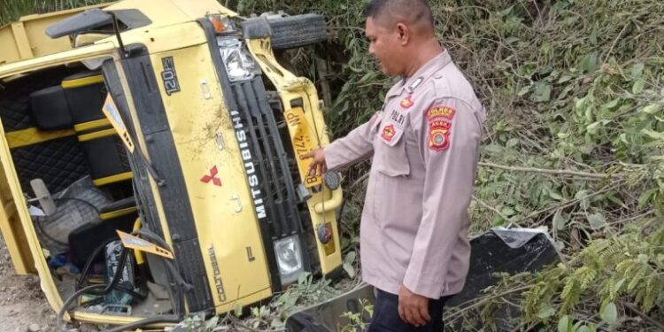 Laka Lantas Satu Dum Truk Terbalik, Polisi Amankan Lokasi