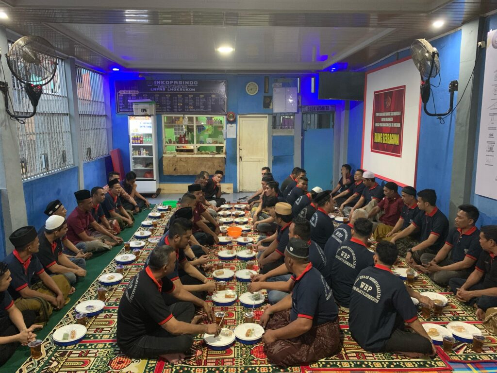 ACEH UTARA – Lapas Kelas IIB Lhoksukon, Aceh Utara menggelar buka puasa bersama Warga Binaan Pemasyarakatan (WBP), Rabu, 12 Maret 2025. Setelah itu dilanjutkan shalat magrib berjamaah, shalat tarawih, mendengarkan tausiah keagamaan dan tadarus.