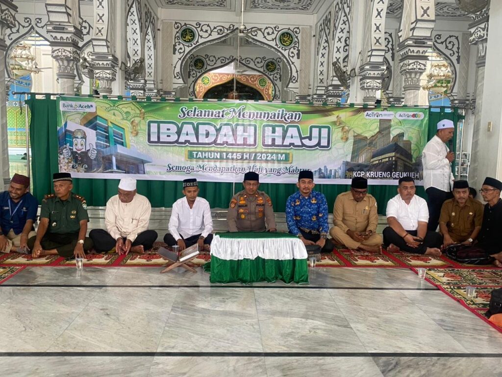 LHOKSEUMAWE – Plh Kapolsek Dewantara mengucapkan selamat menunaikan ibadah haji kepada Jemaah Haji asal Dewantara yang acara pelepasannya di laksanakan di Mesjid Besar Bujang Salim Desa Keude Krueng Geukuh, Kec. Dewantara, Provinsi Aceh, senin (3/6/2024) sekitar pukul 09.30 WIB.