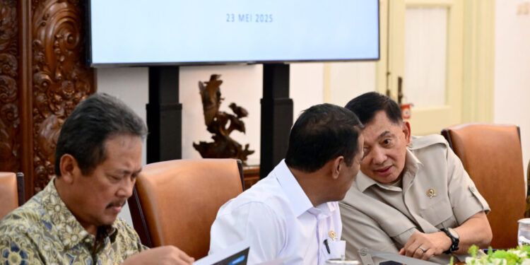 Jakarta – Menteri Pertahanan RI Sjafrie Sjamsoeddin bersama sejumlah menteri dan Satgas Hilirisasi menghadiri rapat terbatas (ratas) yang dipimpin oleh Presiden RI Prabowo Subianto, di Istana Merdeka, Jakarta, pada Jumat, (23/5/2025). Rapat tersebut dilaksanakan guna membahas percepatan proyek hilirisasi nasional dan tindak lanjut terhadap proyek prioritas hilirisasi yang mencakup berbagai sektor strategis.
