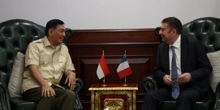 Jakarta – Menteri Pertahanan RI Sjafrie Sjamsoeddin menerima kunjungan Duta Besar (Dubes) Italia untuk Indonesia H.E. Roberto Colaminè, di kantor Kementerian Pertahanan, Jakarta, Kamis (17/4/2025).