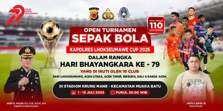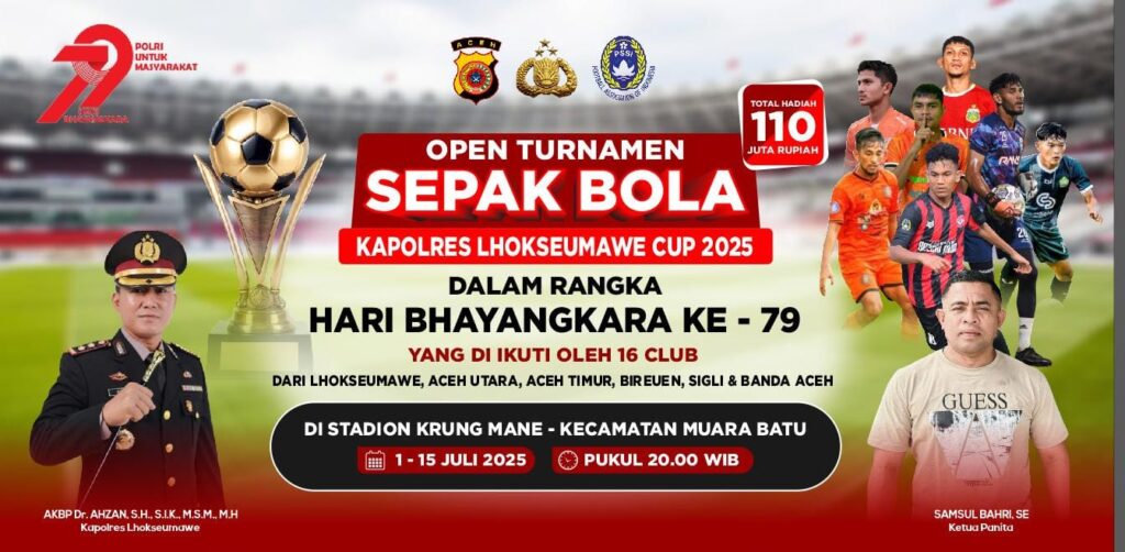Lhokseumawe – Dalam rangka memeriahkan Hari Bhayangkara ke-79, Polres Lhokseumawe menggelar Open Turnamen Sepak Bola “Kapolres Lhokseumawe Cup 2025” yang akan berlangsung di Stadion Krung Mane, Kecamatan Muara Batu, Kabupaten Aceh Utara. Ajang bergengsi ini digelar mulai 1 hingga 15 Juli 2025.