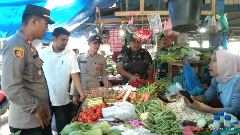 LHOKSEUMAWE – Kapolsek Syamtalira Bayu, Iptu Sirya Iqbal, SH, MH bersama unsur Muspika blusukan ke pasar tradisional di Kecamatan Syamtalira Bayu, Aceh Utara, wilayah hukum Polres Lhokseumawe, Rabu (15/2/2023), kegiatan tersebut untuk memonitoring stok sembako.