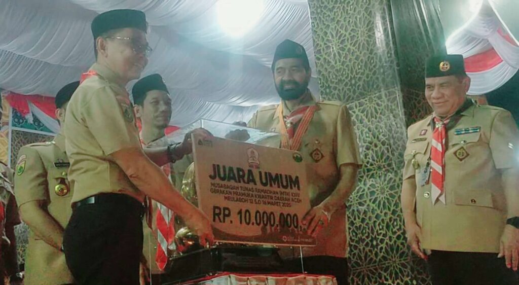 MEULABOH-Kegiatan MTR Ke 24 resmi di tutup oleh Gubernur Aceh Muzakir Manaf, Minggu (16/3/2025) dini hari. Muzakir Manaf juga nenyerahkan tropy juara umum kepada Kontingen Kabupaten Aceh Besar.