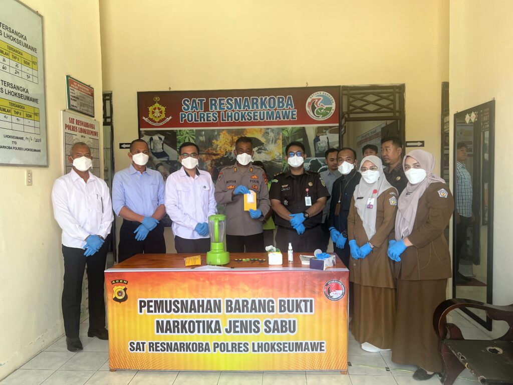 Proses pemusnahan dilakukan dengan metode khusus — sabu diblender, dilarutkan dengan air, dicampur pertalite, lalu dibuang ke septic tank — untuk memastikan barang bukti tersebut tak bisa disalahgunakan kembali. Pemusnahan ini juga telah mendapatkan ketetapan sah dari Kejaksaan Negeri Lhokseumawe.