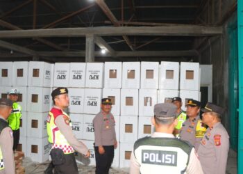 LHOKSEUMAWE - Personel gabungan Polres Lhokseumawe melakukan patroli dan mengawasi situasi di gudang logistik pemilu di wilayah hukum Polres Lhokseumawe,...