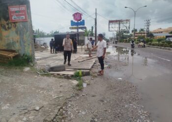 Aceh Utara – Polisi, TNI bersama perangkat desa setempat bergotong royong menambal jalan berlubang di Jalan Medan–Banda Aceh, tepatnya di...