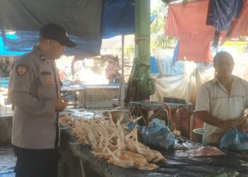 LHOKSEUMAWE - Personel Polsek Nisam mengecek persediaan daging ayam di pasar Gampong Meucat, Kecamatan Nisam, Aceh Utara, wilayah hukum Polres...