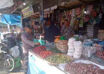 LHOKSEUMAWE - Personel Polsek Syamtalira Bayu, Polres Lhokseumawe temui pedagang di pasar tradisional Keude Bayu, Aceh Utara, wilayah hukum...