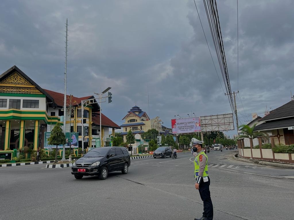 LHOKSEUMAWE - Personel Polsek Sawang melaksanakan strong poin atau pengaturan lalu lintas di Simpang Jalan Pendidikan, Sawang, Aceh Utara,...