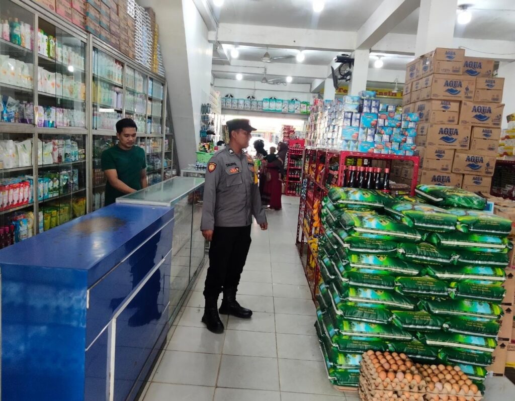 LHOKSEUMAWE - Dua Personel Polsek Simpang Keuramat turun ke pasar tradisional dan toko kelontong di Kecamatan Simpang Keuramat, Aceh...