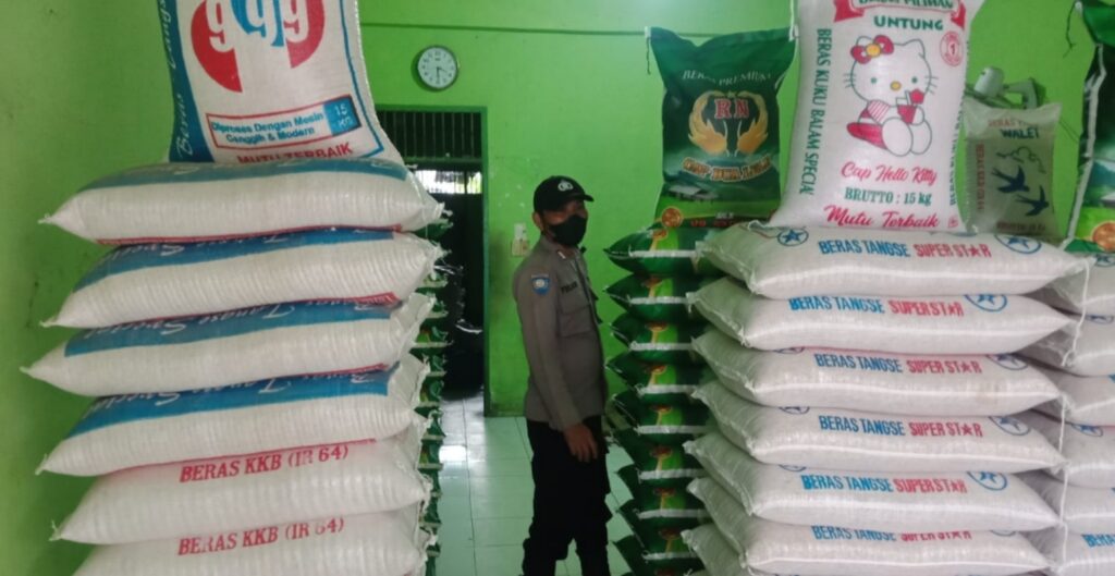 LHOKSEUMAWE - Personel Polsek Muara Batu mengecek stok beras di toko kelontong dan swalayan di Kecamatan Muara Batu, Aceh...