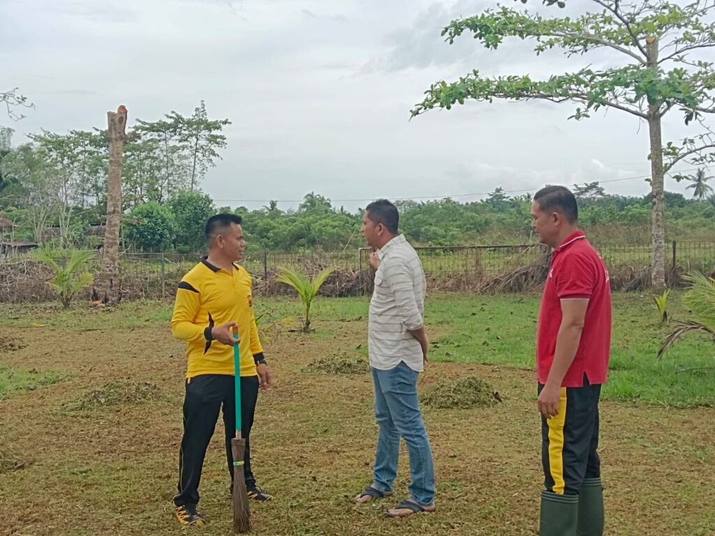 LHOKSEUMAWE - Kapolsek Blang Mangat, Iptu Saprudin, SH, MH bersama warga gotong royong membersihkan pekarangan Masjid Babul Jannah, Gampong...